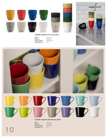 LT52236 | Sagaform Inka Tasse 270ml Marke : Sagaform Material : Steingut Abmessungen : ø80x90mm 100 Stück in € : 4,14 LT52238 | Sagaform Brazil Becher 250ml Marke : Sagaform Material : Steingut 10 100 Stück in € : 3,75 : ø87x81mm Abmessungen